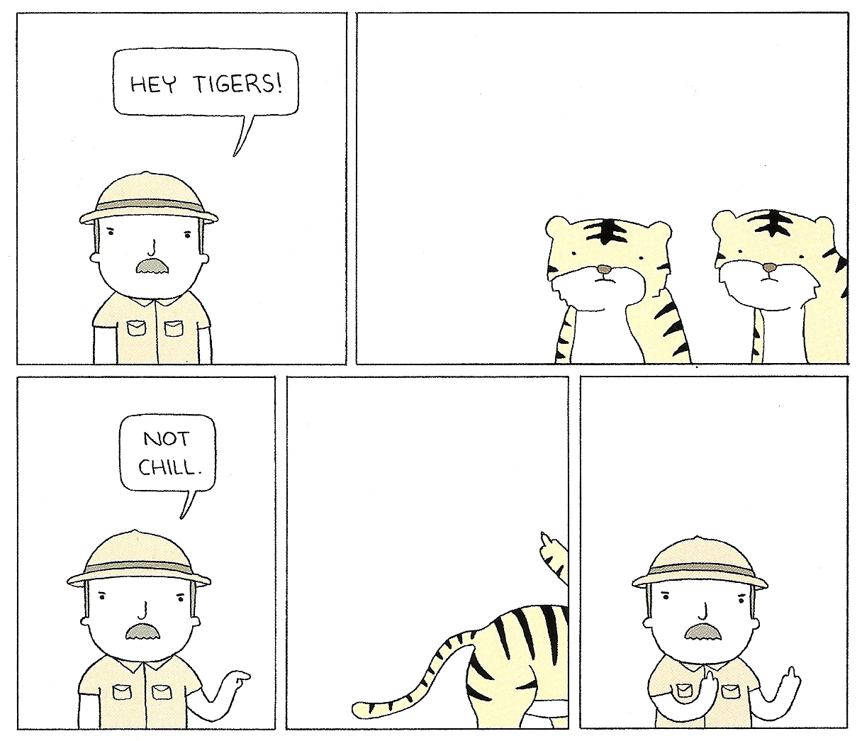 The prose was sort of unwelcome, as I don't like switching gears between comics and prose, but it should be noted that the prose is all very, very short–like, two pages per story–and they have a similar point-of-view as the cartoons. Still, I don't like prose in my comics, man. Like, coffee is good. And tea is good. But if you put a tea bag in a cup of coffee...? Why would you do that...?